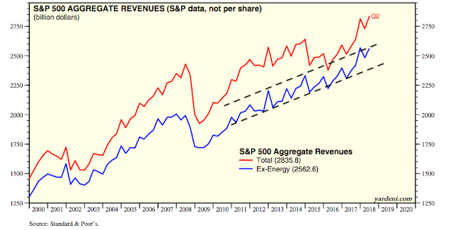 Excluding the volatile energy sector, sales for the remainder of the S&P have continued to trend higher at about the same rate over the past 7 years (blue line; from Yardeni).