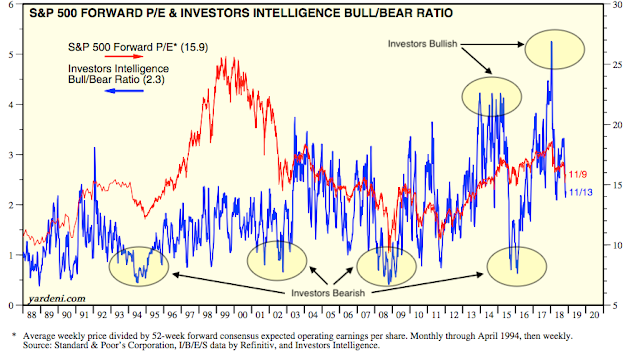 Valuations are not cheap, but if investors once again become ebullient, there is room for valuations to expand. Why? When investors become bullish (blue line), valuations rise (red line). Investors had been pessimistic in early 2016 and then became far too optimistic at the market peak in January 2018. That has been greatly reset in recent months (from Yardeni).