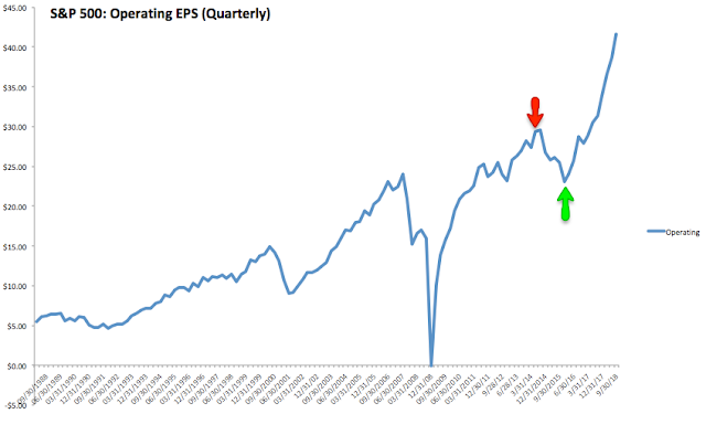 The arrows again indicate the period when oil prices fell 70%. The new high in total EPS comes with energy sector EPS at two-thirds of its level in mid-2014.