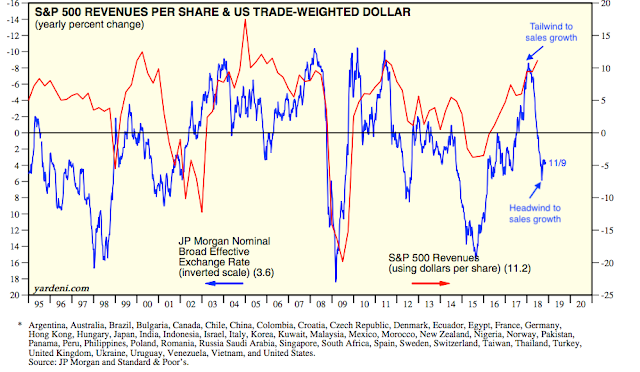 How does the dollar impact sales growth? Companies in the S&P derive about half of their sales from outside of the US. When the dollar rises in value, the value of sales earned abroad (in foreign currency) falls. If foreign sales grow 5% but the dollar gains 5% against other currencies, then sales growth will be zero in dollar terms. The chart below compares changes in the dollar (blue line; inverted) with growth in S&P sales (red line): a higher dollar corresponds with lower sales (from Yardeni).