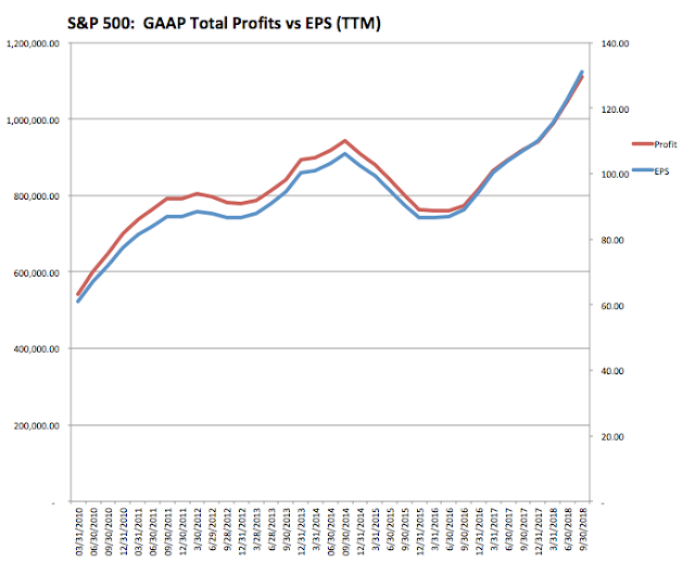 Fundamentals have been driving the stock market higher, not valuations: earnings during the past 1 year and 2 years have risen faster than the S&P index itself (meaning, valuations contracted). The strong growth in company profits is not due to a net share reduction (e.g., buybacks) either.