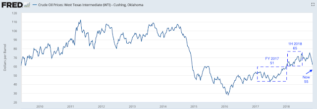 Third, the price of oil was tracking a healthy 28% yoy gain until October; the price has since fallen 25%, to where it had been a year ago. In other words, the energy sector had been a tailwind to overall sales and EPS growth; below $65, it becomes a headwind in the first half (1H) of 2019.