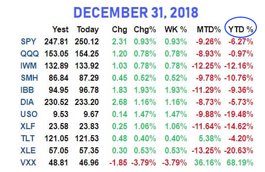 2018 ended with a thump. NDX lost 1%, SPX lost 6%, small caps lost 12% and financials (the consensus favorite a year ago) lost 15%. Treasury bonds also dropped for the year, as did commodities. The only winner in 2018 was volatility (table from alphatrends.net). Enlarge any chart by clicking on it.