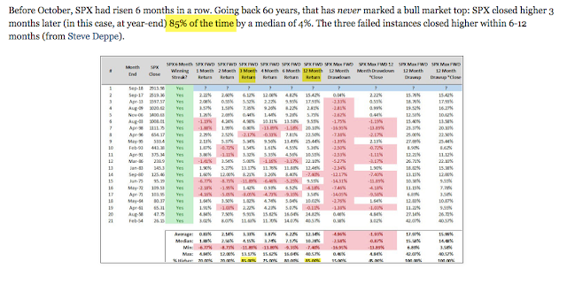 Through September, SPX had gained 6 months in a row. Over the past 60 years, SPX had closed higher three months later 85% of the time (and 100% higher within a year). The average interim drawdown was just 5% and the worst drawdown was 16%. Instead, SPX dropped 20% in the next 3 months and closed the year lower. If SPX doesn't make a new ATH by September, this will be another first (from Steve Deppe).