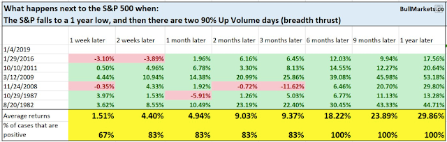 The Christmas Eve fall also made a new one-year low. When this has been followed by two 90% up volume days within 2 weeks, SPX has continued higher over the next 2, 4 and 8 weeks in 5 of 6 instances (83% but a small sample). But note that half of these had a 4-12% drawdown in the next 3 months (table from Troy Bombardia).