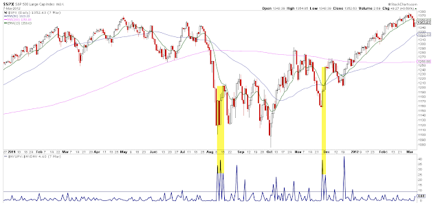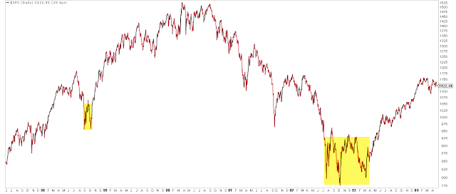 (For better or worse, "bear markets" are most commonly defined as a high to low drop of more than 20% in SPX on a closing basis. Is it arbitrary? Yes. So is a cut-off of 15%, 19% or 25%. Thus, 1998 and 2011 don't strictly qualify. We don't make the rules).