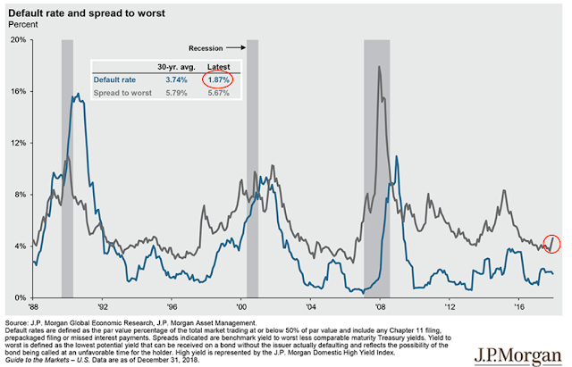 High yield spreads have not blown out during the current market correction (circle), and default rates remain well below average. This part of the bond market is not signaling any economic trouble (from JPM).