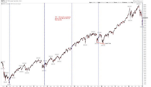Looking back at the Bespoke table of 10% rallies after a 15% drop, only 4 of those 12 rallies triggered a Zweig breadth thrust (June 1962, October 1974, March 2009 and October 2011). In none of those 4 was there a "lower low", although in 2 (1962 and 1974) a low retest occurred. In other words, exceptional breadth after a sharp fall of more than 15% has marked the cyclical low.