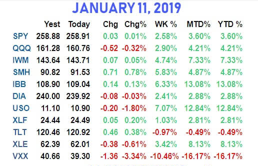 The bounce that started on Christmas Eve continued this week. SPX gained for a third week in a row, adding 2.6%. NDX was up 3% and small caps were up nearly 5%. Volatility fell 10% (table from alphatrends.net). Enlarge any chart by clicking on it.