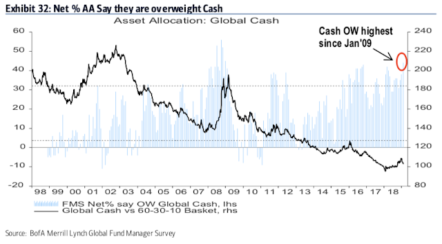 They are overweight cash by the highest amount since January 2009, the month before the bear market low.