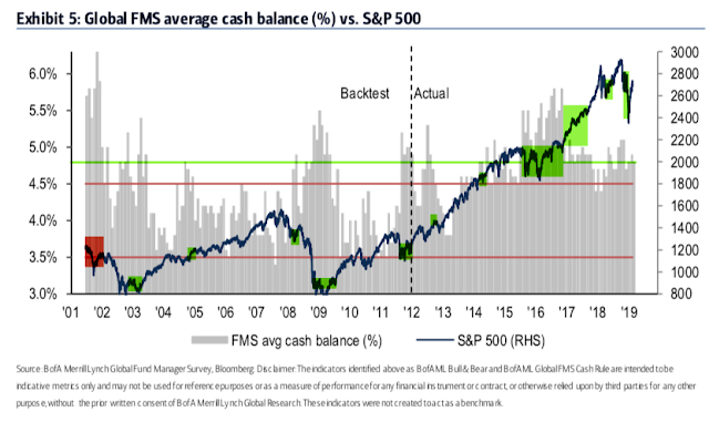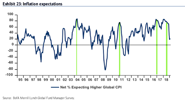 In November 2017, cash level fell to 4.4%, the lowest level since October 2013. Equities peaked in January and then fell 20% during 2018