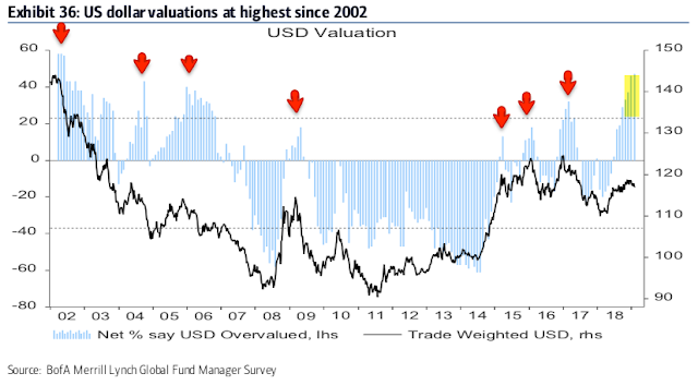Since 2004, fund managers surveyed by BAML have been very good at determining when the dollar is overvalued (arrows).