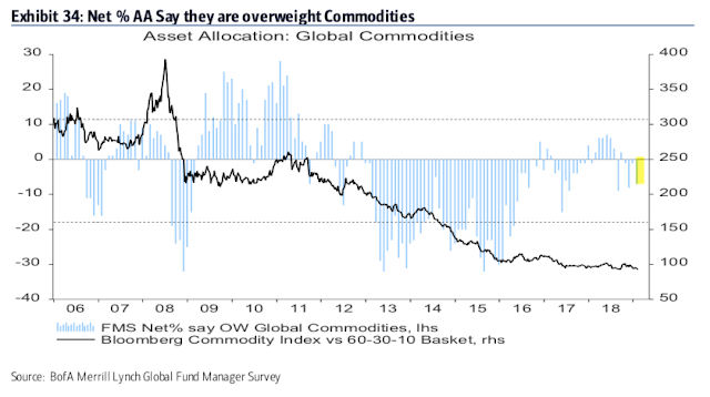 Among the various ways of measuring investor sentiment, the Bank of America Merrill Lynch (BAML) survey of global fund managers is one of the best as the results reflect how managers are allocated in various asset classes. These managers oversee a combined $600b in assets.
