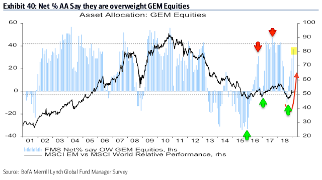 By April 2018, allocations had risen to +43% overweight, near a 7 year high: the region underperformed over the next 6 months.