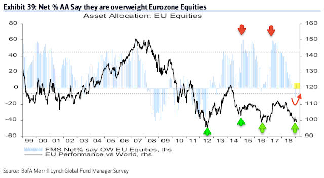 Allocations fell to just -11% overweight in January, a 6-1/2 year low. This is when the region started to outperform in 2012, 2014 and 2016-17 (green arrows).