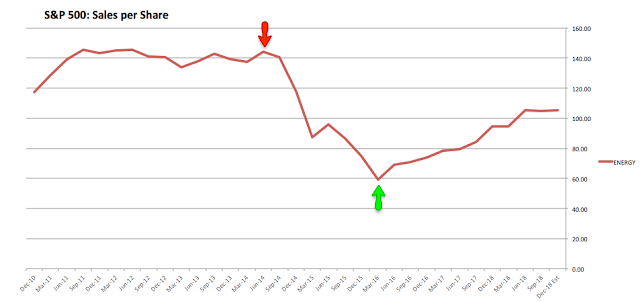 The arrows in the chart above and those that follow indicate the period from 2Q14 to 1Q16 when oil prices fell 70%. The negative affect on overall S&P sales (above) and the energy sector alone (below) is easy to spot.