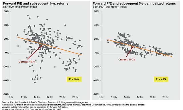 Importantly, valuations have almost no bearing on the market's 1-year forward return (left side). But over the longer term, current valuations suggest that single digit annual returns are odds-on (right side; from JP Morgan).