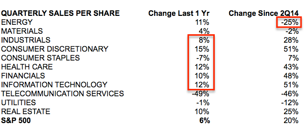 The six sectors with the highest weighting in the S&P have grown an average of 8% in the past year (box in middle column) and, since the peak in oil in 2Q14, their sales have grown an average of 38%. In contrast, energy sector sales have declined 25% (far right column).