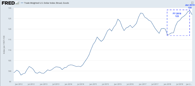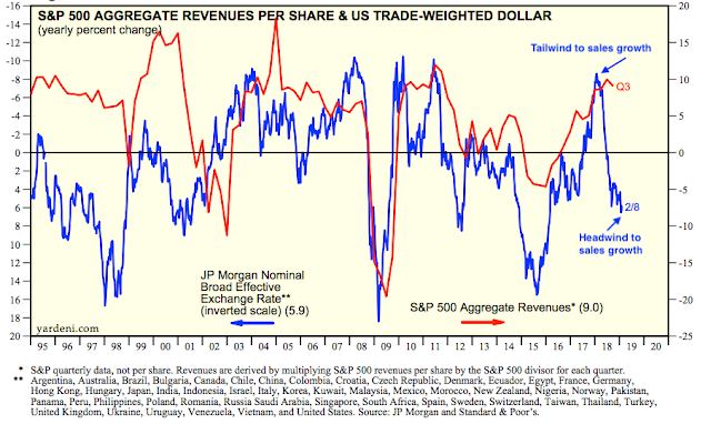 The dollar has become a minor headwind for sales: in the past year (thru 4Q18), the dollar appreciated by 6%; this accounts for about a 3 percentage point decline in growth in corporate sales. For the current quarter (1Q19), the dollar is pacing an 8% yoy appreciation.How does the dollar impact sales growth? Companies in the S&P derive about half of their sales from outside of the US. When the dollar rises in value, the value of sales earned abroad (in foreign currency) falls. If foreign sales grow 5% but the dollar gains 5% against other currencies, then sales growth will be zero in dollar terms. The chart below compares changes in the dollar (blue line; inverted) with growth in S&P sales (red line): a higher dollar corresponds with lower sales (from Yardeni).