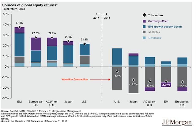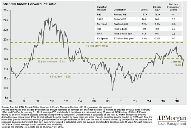At the end of 2018, the combination of ~25% earnings growth and a 6% fall in equity prices left valuations at 14.4x, the same level as in 2010 and well below their 25-year average. The continued rally since then has brought valuations right back to the average (from JPM).