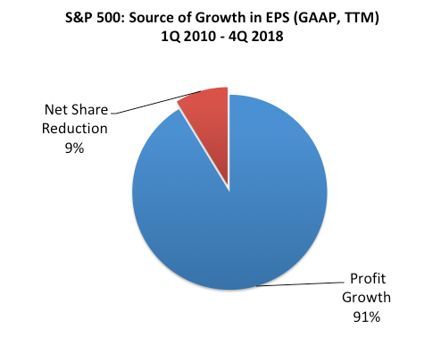 First, companies have been accused of inflating their financial reports through a net reduction in shares through, for example, corporate buybacks. In reality, however, over 90% of the growth in earnings in the S&P over the past 9 years has come from better profits, not a net reduction in shares. Better profits have driven growth, not "financial engineering."