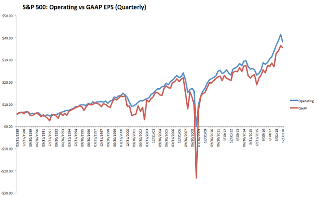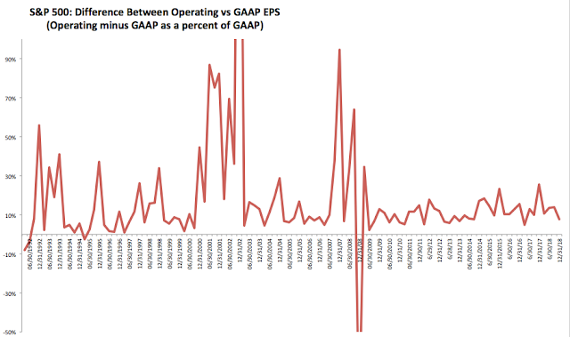 It's accurate to say that operating earnings somewhat overstate and smooth profits compared earnings based on GAAP, but that is not new. In fact, the difference between operating and GAAP earnings in the past 25 years has been a median of 10% and the recent history has been no different (it was 8% in the most recent quarter). Operating earnings overstated profits by much more in the 1990s and earlier in the current bull market. The biggest differences have always been during bear markets.