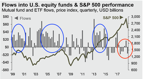 It's hard to believe that investors have already reached peak bullishness. Fund flows into equity mutual funds and ETFs was strong before both the 2000-02 and 2007-09 bear markets, and even before the 2015-16 mini-bear market (blue circles). In comparison, fund flows have been negative for 4 of the past 6 quarters (red circle; from JPM).