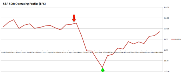 The arrows in the chart above and those that follow indicate the period from 2Q14 to 1Q16 when oil prices fell 70%. The negative affect on overall S&P sales (above) and the energy sector alone (below) is easy to spot.