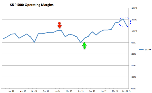 Likewise, overall S&P profit margins peaked at 10.1% in early 2014, fell to 8% at the end of 2015 and have since rebounded to 10.9% in 4Q18. However, margins fell this quarter from a high of 12.1% in 3Q18.