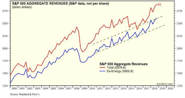 Excluding the volatile energy sector, sales for the remainder of the S&P have continued to trend higher at about the same rate over the past 8 years, with some acceleration in the past 2 years (blue line; from Yardeni).