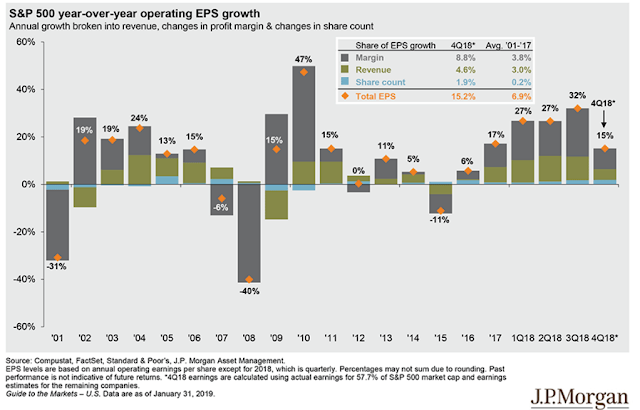 Fourth, corporate tax cuts were a major tailwind to earnings in 2018. Analysts estimate that these likely added 10 percentage points to growth, meaning baseline growth of 5% could have jumped to 15% by virtue of tax cuts alone.