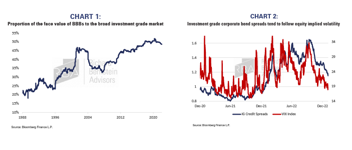 It is clear that one need not own credit to generate income at the moment. Treasury yields are at post financial crisis highs, after all! But don’t forget the potential for total return. The decision of whether to own IG bonds (credit risk and interest rate risk) or Treasuries (just interest rate risk) comes down to how credit spreads are likely to change. If one owned a 20-year Treasury bond and interest rates across the yield curve fell by 50bps, they should generate a return of nearly 10%. For IG bonds to generate the same return, credit spreads on IG bonds would need to decline to near post crisis lows. This seems like an unlikely outcome given lower Treasury yields tend to cause wider, not tighter, spreads, especially when accompanied by an earnings recession. On the other hand, if interest rates were to rise, it would not be surprising to see credit spreads widen (perhaps in a disorderly way), creating a losing outcome for IG bonds from both interest rates and credit spreads.