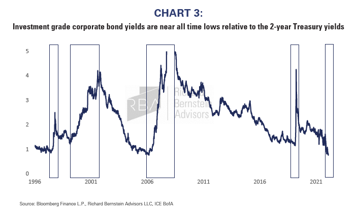 Consider the following: an investor today can buy a 2-year Treasury note with virtually no credit risk and little downgrade risk for just 60bps less yield than what is offered by the investment grade market. On that basis, 2-year Treasuries have rarely been cheaper relative to IG bonds and has historically been a great opportunity to reduce credit risk. The IG market appears to be priced for perfection by this measure.