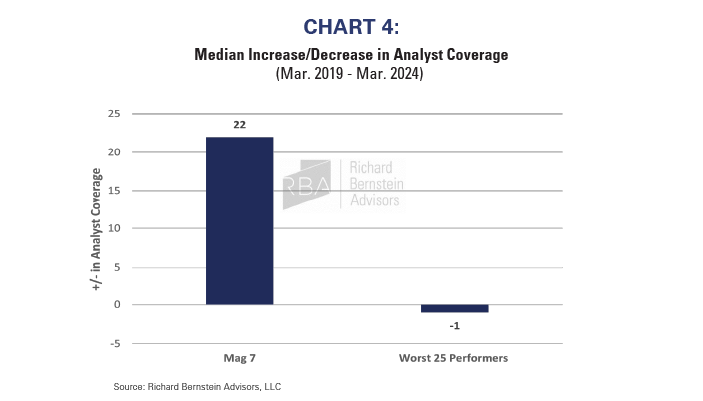 Chart 4 shows that the Magnificent 7 are far from neglected stocks. Rather, coverage has increased significantly during the past 5 years. The median Magnificent 7 stock has 22 more analysts covering the stock than five years ago. Compare Magnificent 7’s increase in coverage over the last 5 years to the median decrease in coverage among the 25 worst performing stocks in the S&P 500®.