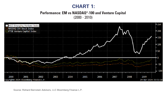 Charts 1 and 2 show how hot becomes cold and cold becomes hot by showing the performance of Emerging Markets, the NASDAQ®-100, and Venture Capital over two decades. From 2000 to 2010 Emerging Markets significantly outperformed both NASDAQ® and Venture Capital. However, the exact opposite occurred from 2010 to 2020.