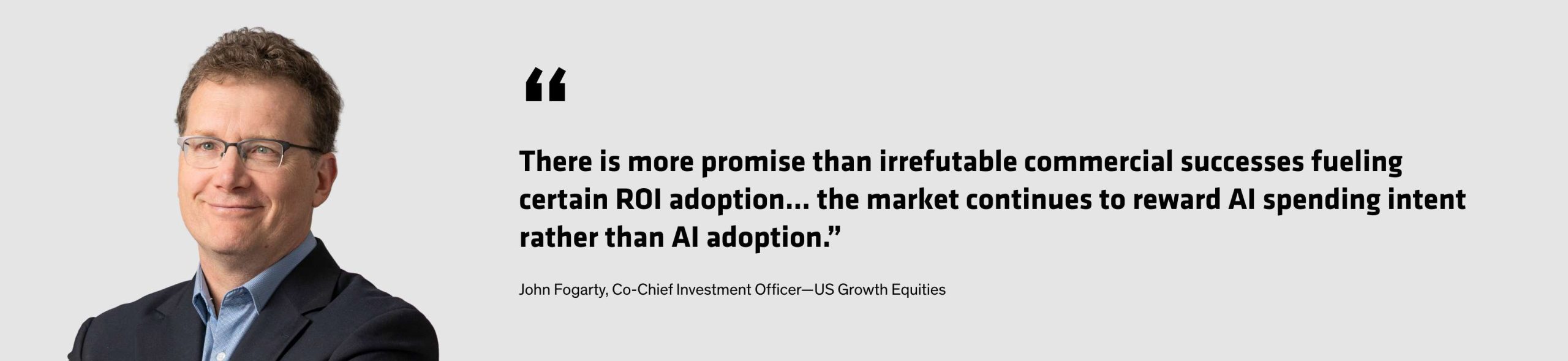 John: AI has transformed computer programming and transitioned digital advertising analytics from machine learning. Beyond that, there is more promise than irrefutable commercial successes fueling certain ROI adoption. As active managers, especially given our constructive view on this new compute paradigm, we are excited to identify successful AI adoption that improves productivity and sustainable profitability. However, these success stories have not progressed linearly, which may point to slower adoption or the need for incremental model improvement. While the clock ticks, the market continues to reward AI spending intent rather than AI adoption.