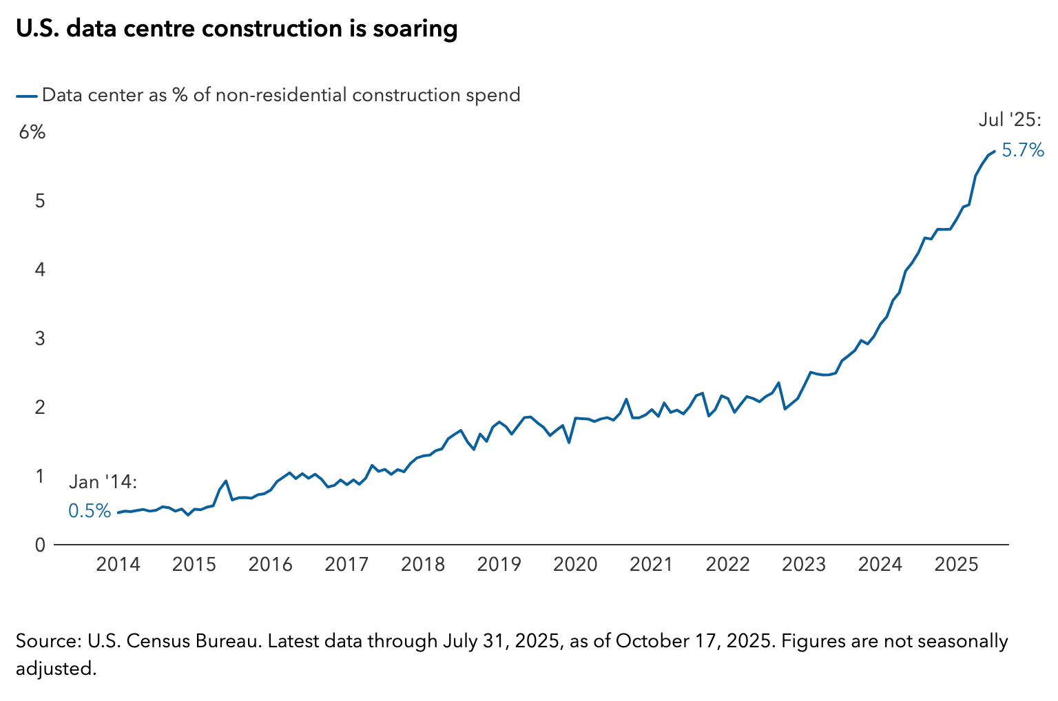 To ensure that progress continues, U.S. based technology giants like OpenAI, Microsoft, Google, Meta Platforms and Oracle have committed hundreds of billions of dollars to building AI infrastructure. Fueled by such investment, global semiconductor sales could exceed US$1 trillion by 2030. More broadly, investment in data centres accounted for 5.5% of private non-residential construction spending as of June 2025.