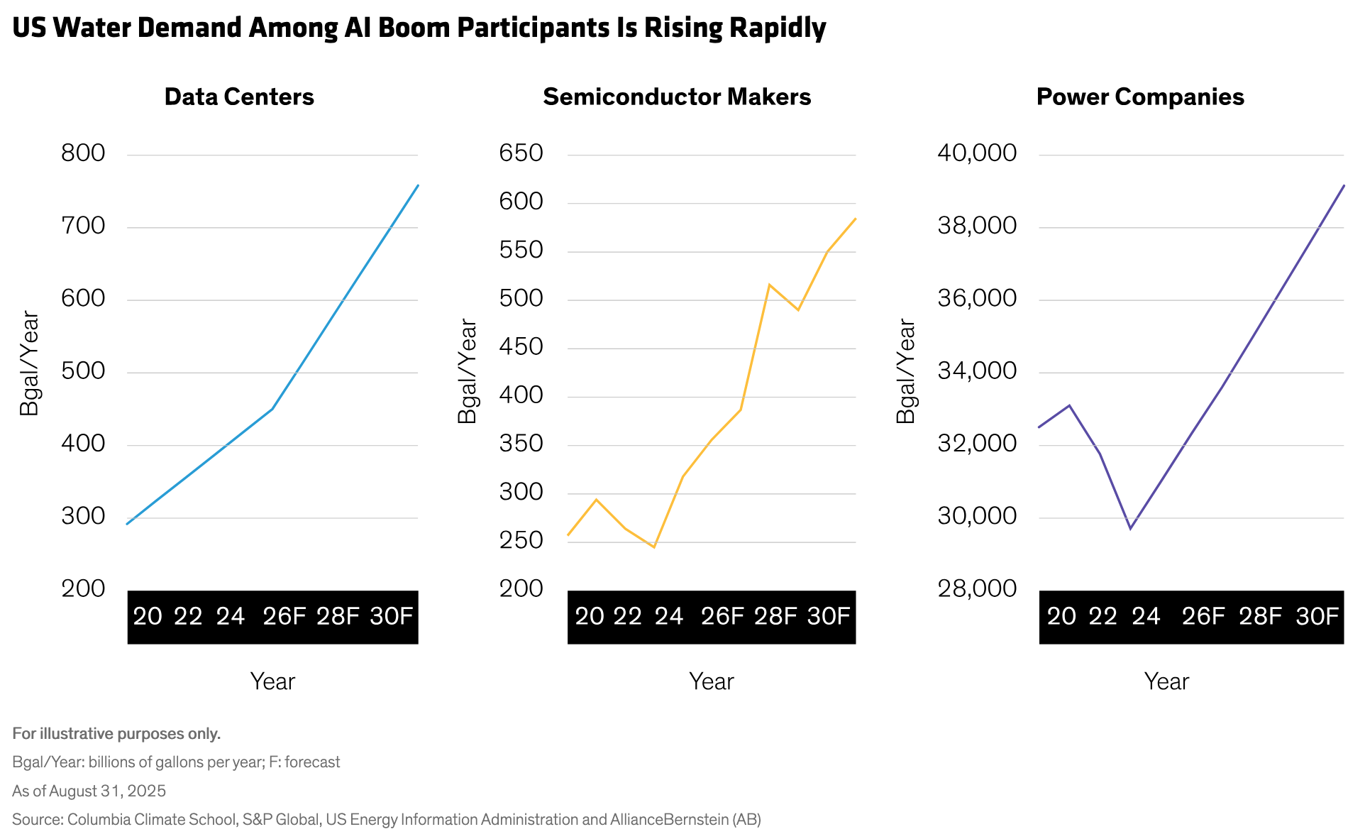 AI’s rapid growth is driving demand not only for electricity but also for the clean water needed to run its physical infrastructure. As data centers expand, rising water intensity is straining supplies and testing long-term sustainability. In our analysis, these pressures create both risks and opportunities for active investors.