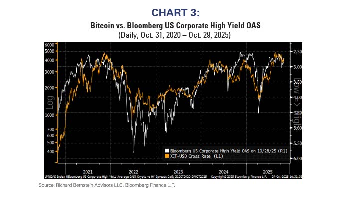 Chart 2 shows the relationship between Bitcoin and the Bloomberg Financial Conditions Index. It seems clear that liquidity has been a driving force of the crypto bull market. Chart 3 shows the close relationship between Bitcoin and high yield corporate bonds. Historically tight credit spreads have been suggesting lower quality bonds’ performance is also being driven by liquidity.