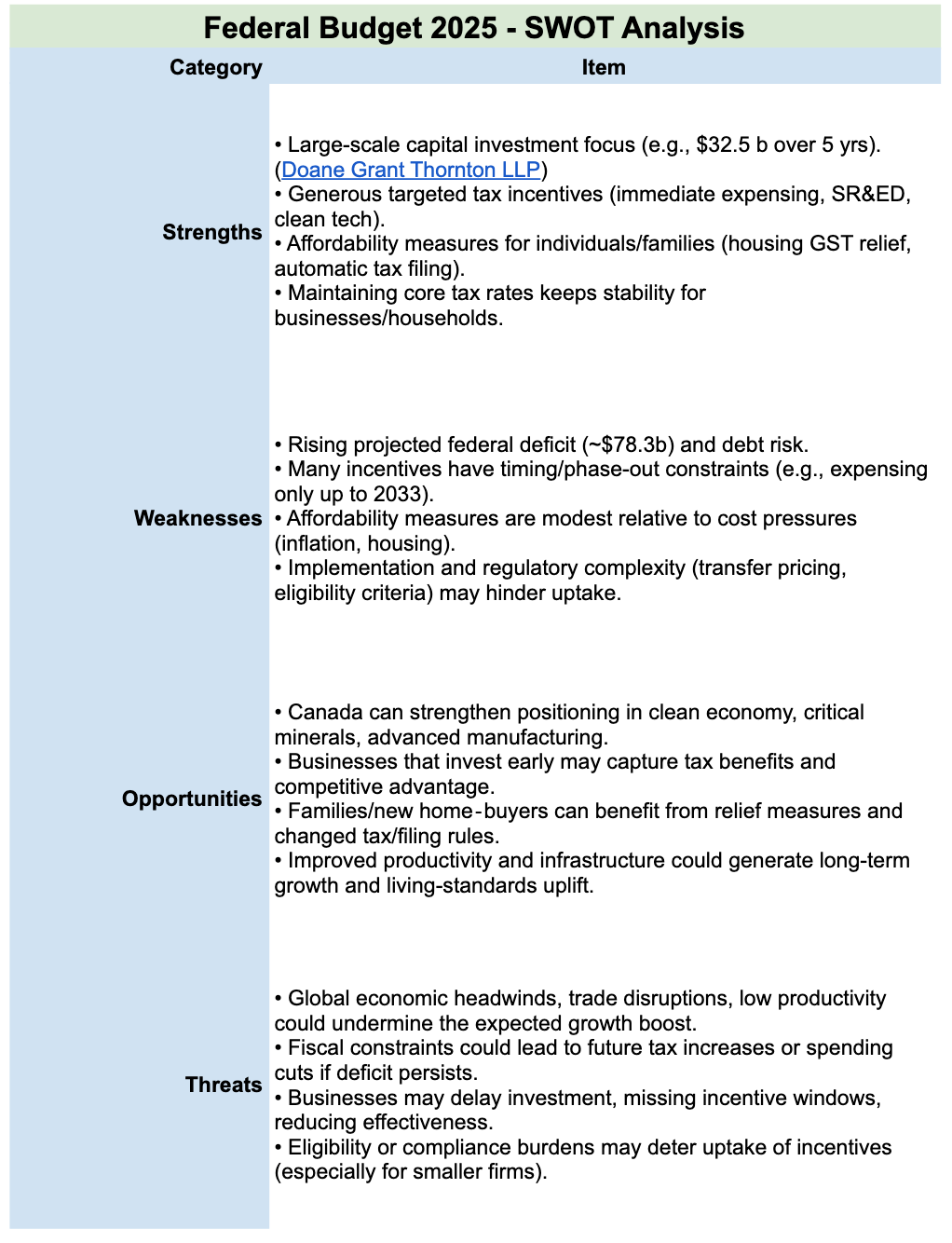 - SR&ED Program Boost: The R&D credit limit jumps from $4.5 million to $6 million, and the program promises faster audits and AI-assisted reviews.