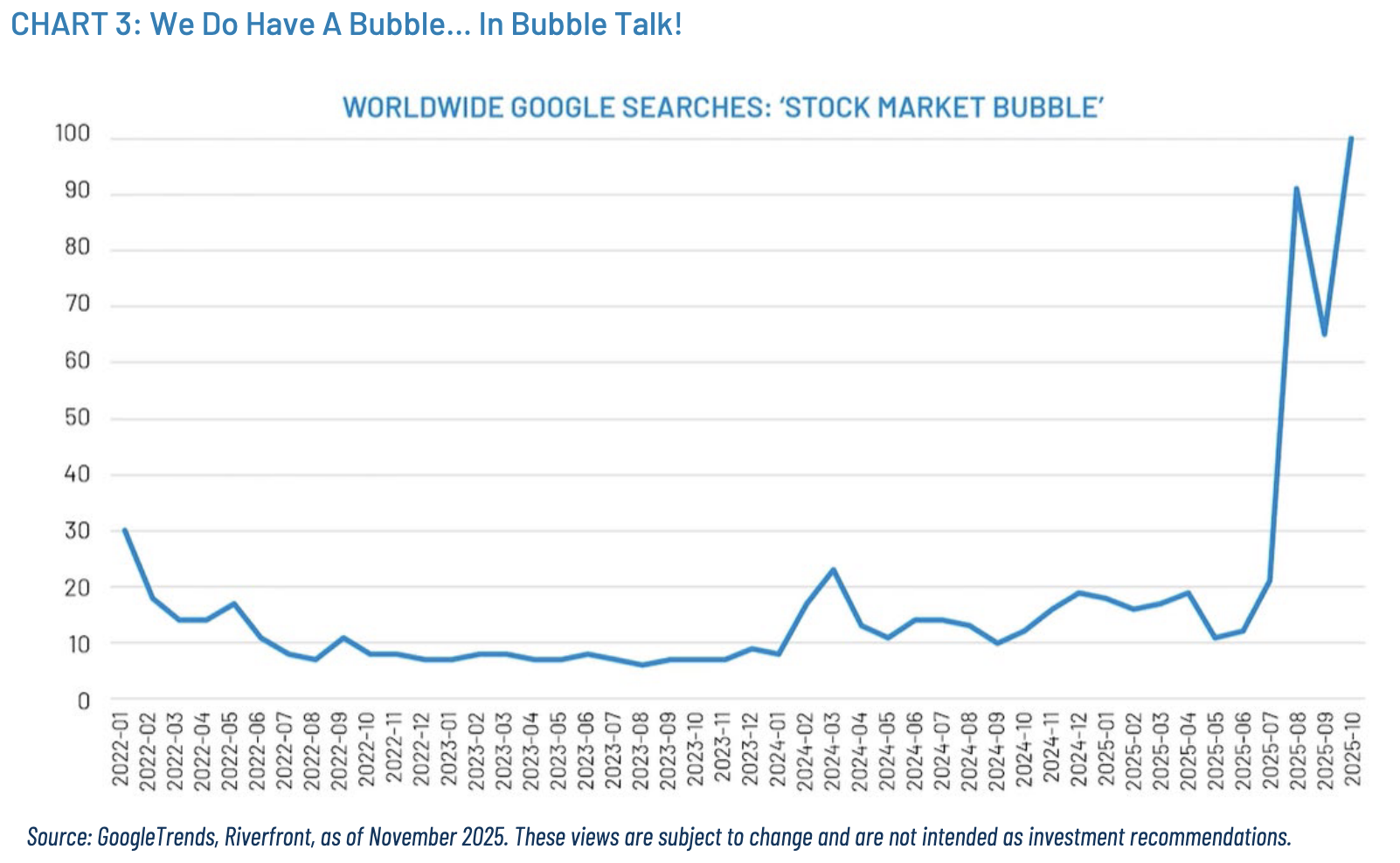 - Chart 3 (Page 3): A near-satirical look at Google Trends shows a vertical spike in searches for âstock market bubbleâ in late 2025. Market hysteria? Maybe. Market top? Not necessarily.