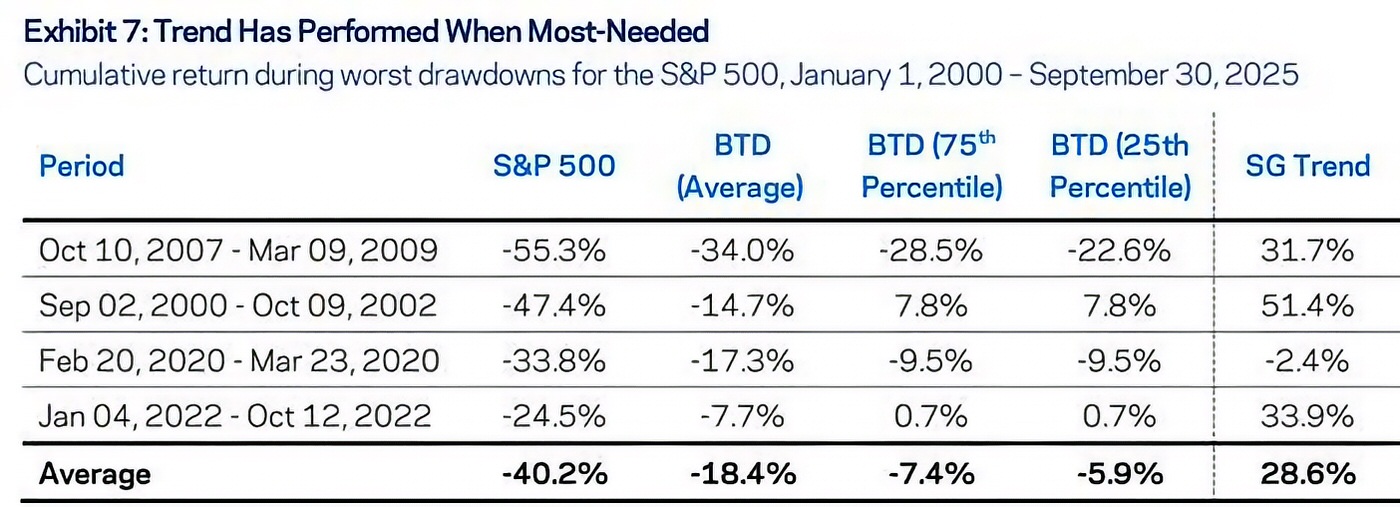 Using broad trend-following proxies like the SG Trend Index, Swedroe shows that trend strategies have historically delivered meaningful alpha relative to equities. More importantly, they’ve done so when investors needed help the most. During the worst market drawdowns since 2000—periods where losses exceeded 20%—trend-following strategies posted strong positive returns on average. Buy-the-dip strategies, by contrast, suffered deep losses.