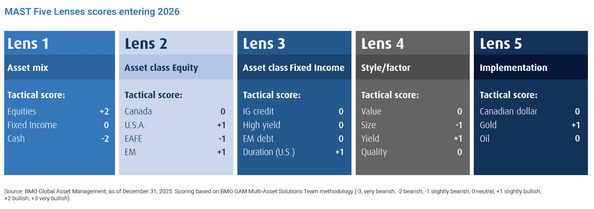 If 2025 was dominated by mega-cap tech, 2026 should be about dispersion. âBroadening equity exposure is likely to be both a risk-management and return-enhancing strategy,â Adatia advises. A glance at BMO GAMâs sector scoring system (page 6) confirms the tilt: Industrials, Health Care, and Financials all score positively, while Tech is marked neutral, and Consumer Discretionary slightly bearish.
