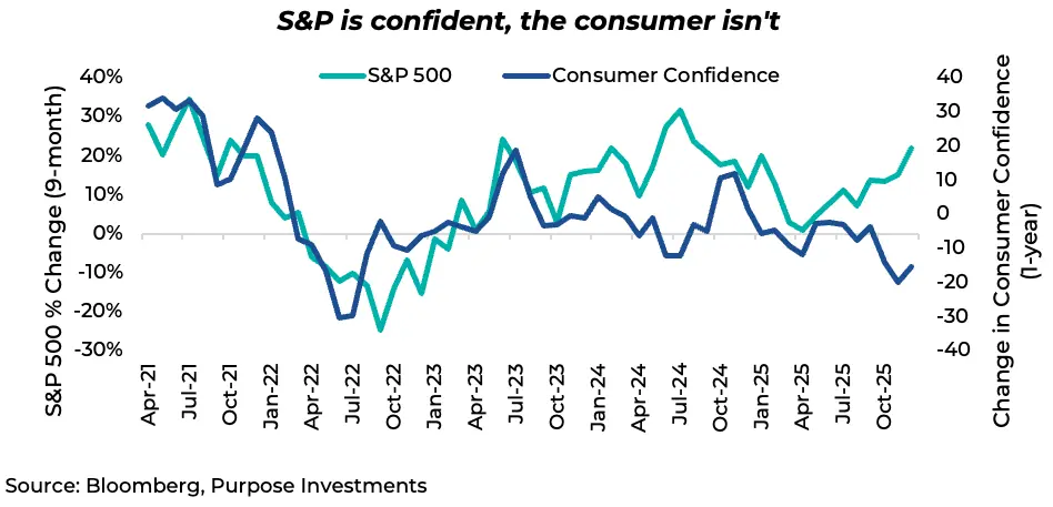 We highlighted the term ‘in aggregate’ because one of the building imbalances is this K-shaped economy. The K term denotes how part of the economy, namely corporations, better off consumers and asset owners, are doing very well. That is the upper arm of the K. But the lower arm is not doing well. This is comprised of lower-income consumers, those who don’t own assets or feel the wealth effect of an S&P hitting all-time highs. The lower arm of the K also feels the impact of inflation harder, as the cost of living is rising faster than wages. This disparity helps explain why the S&P 500 is making new highs while consumer confidence is going in the other direction. Historically, changes in the market correlate strongly with consumer confidence (+0.5 over the past 25 years). But with the K widening, this is not the case, given that confidence is an equal voting survey, not weighted by wealth.