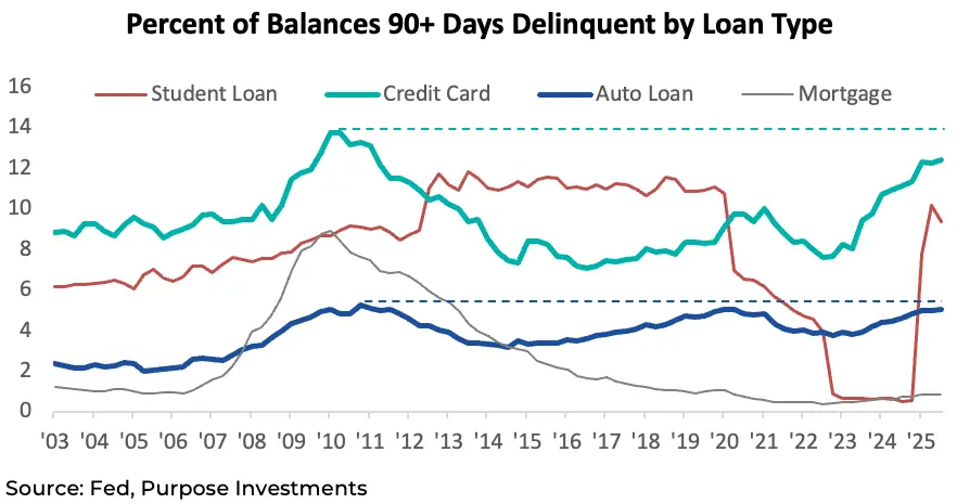 It is ok to ignore student loans, as policy has flipped-flopped on this one. But credit card balances over 90 days delinquent are nearing levels not seen since the financial crisis. Auto loans, too. Clearly, the lower-end consumer is having trouble making ends meet. There are some positives as we head into 2026. The Big Beautiful Bill does have a number of provisions for lower-income consumers. And gasoline prices have dipped below $3/gallon for the first time since 2021.