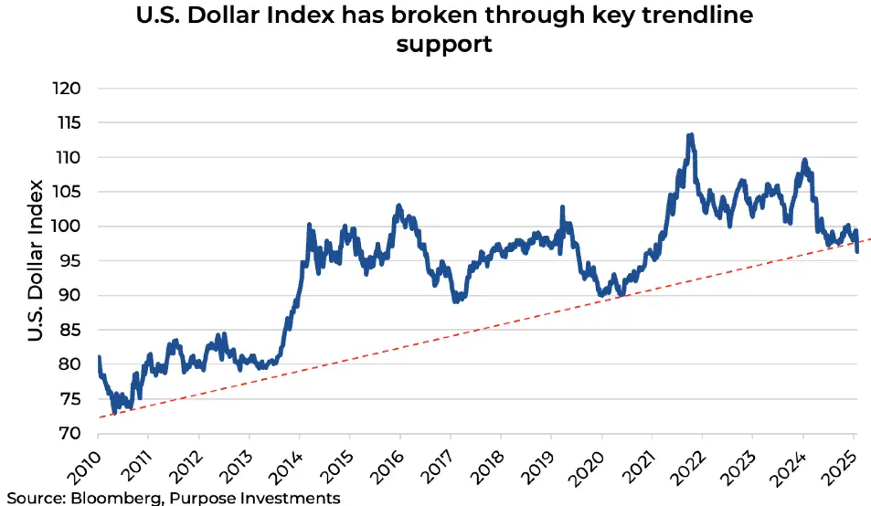 This month, the U.S. dollar broke through a 15-year trendline, the last precipice of support in what has been a record run. After declining 10% last year, the U.S. dollar is off to a rocky start to the year so far. It is becoming clear that the long uptrend has ended. Through a technical lens, the 200-month simple moving average at 92.25 for the DXY Index is now in play, and the medium-term bias remains lower. Despite higher rates and a stronger economy than most of the world, it is past peak dollar appetite. This move marks a potential sea change for global capital allocators. From DIY stock portfolios to the all-in-one ETFs that are very popular, dollar-denominated assets play an important part in most Canadian portfolios.