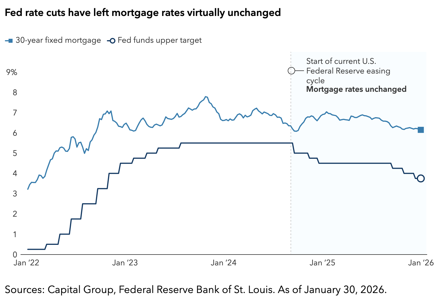 A line chart showing the 30‑year fixed mortgage rate and the Fed funds upper target rate from 2022 to 2026. It highlights that, despite 175 basis points of rate cuts since September 2024, the 30‑year mortgage rate has remained nearly unchanged.