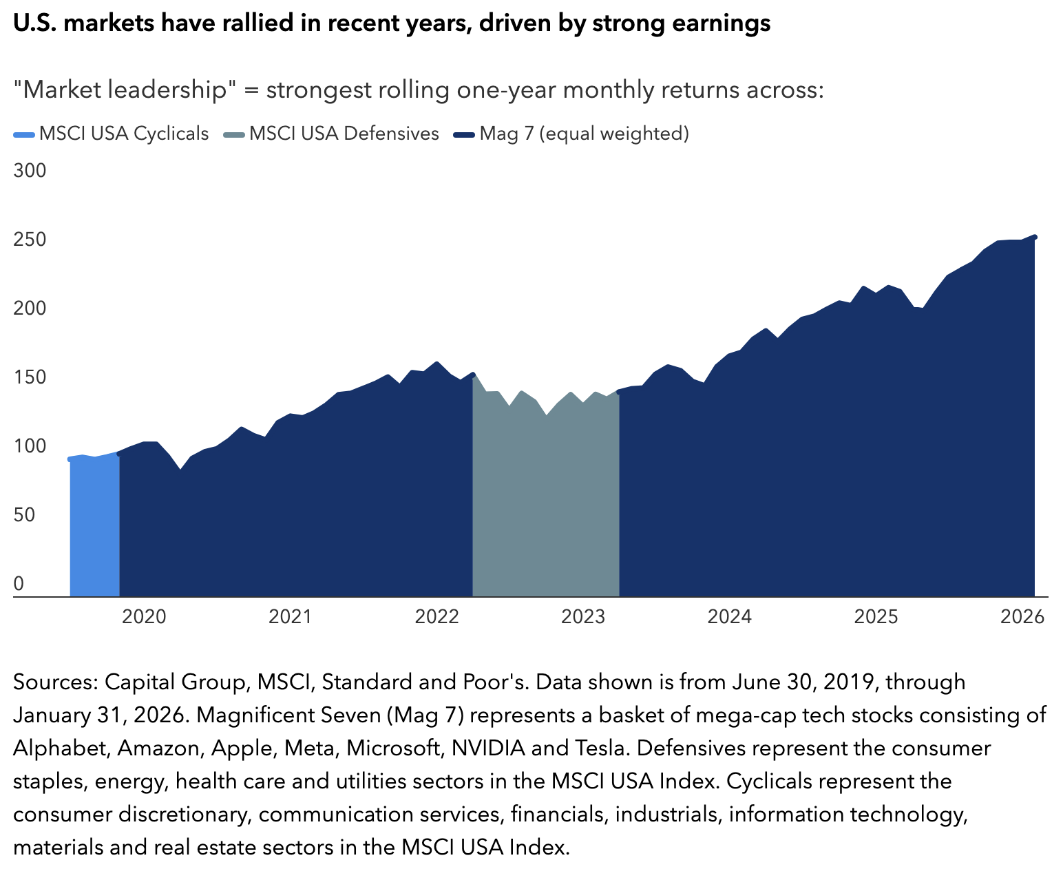 An area chart showing S&P 500 cumulative total returns indexed to 100 on June 30, 2019. Based on rolling one‑year returns, the MSCI USA Cyclicals Index, representing the consumer discretionary, communication services, financials, industrials, information technology, materials and real estate sectors in the MSCI USA Index, led briefly in the second half of 2019 before the Magnificent 7 dominated most of 2020 through early 2022. The MSCI USA Defensives Index, representing the consumer staples, energy, health care and utilities sectors in the MSCI USA Index, led for much of 2022 amid sharply rising inflation, and Mag 7 leadership resumed from 2023 through January 2026.