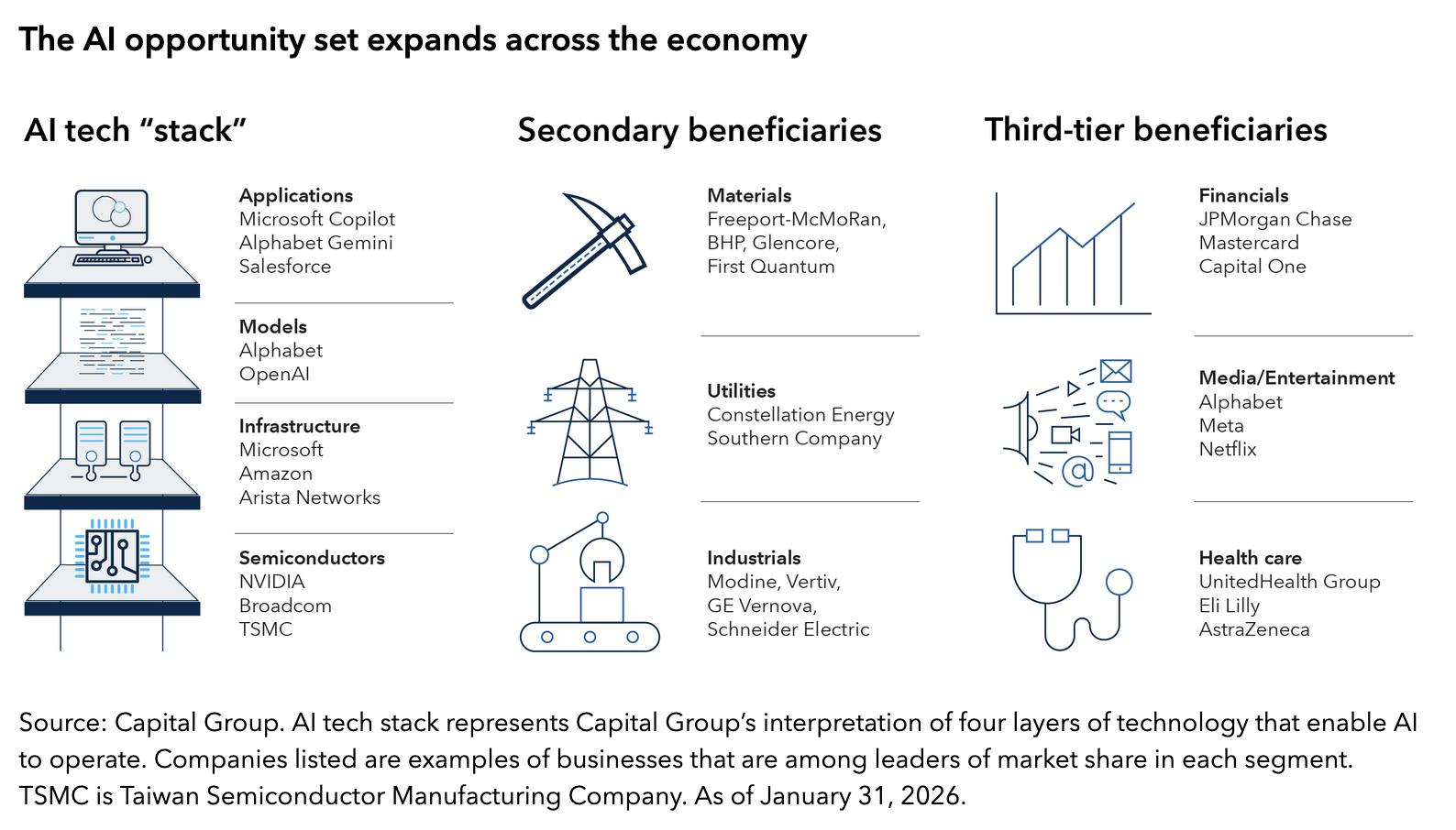 I have to start with the caveat that I, and Capital Group in general, tend to invest at the company level. As you look across a portfolio you do begin to see themes, but I want to emphasize I am not a thematic investor. Most of the leadership companies, particularly in the U.S., are focused one way or another on technology. Some develop software. Others make hardware or computer chips. Some are a mix of the two. Some specialize in IT consulting. And then there's an ancillary group dedicated to building data centres, which require a lot of cooling and electricity. There's a whole series of companies I would refer to as the technology stack. That, no doubt, is the biggest theme we’ve been talking about and will continue to talk about.