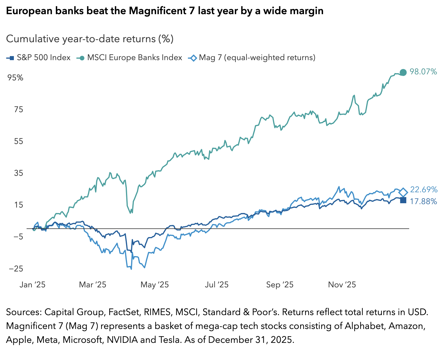 A third theme I would mention — which was a surprise last year, but worth everyone’s attention — is financials. The rise in interest rates over the last few years benefited the financials sector. Not many other sectors celebrated it, but financials did. Financial institutions have been able to get back into the traditional banking market as lending rates increased. European banks particularly so due to more favourable interest rate and regulatory environments.